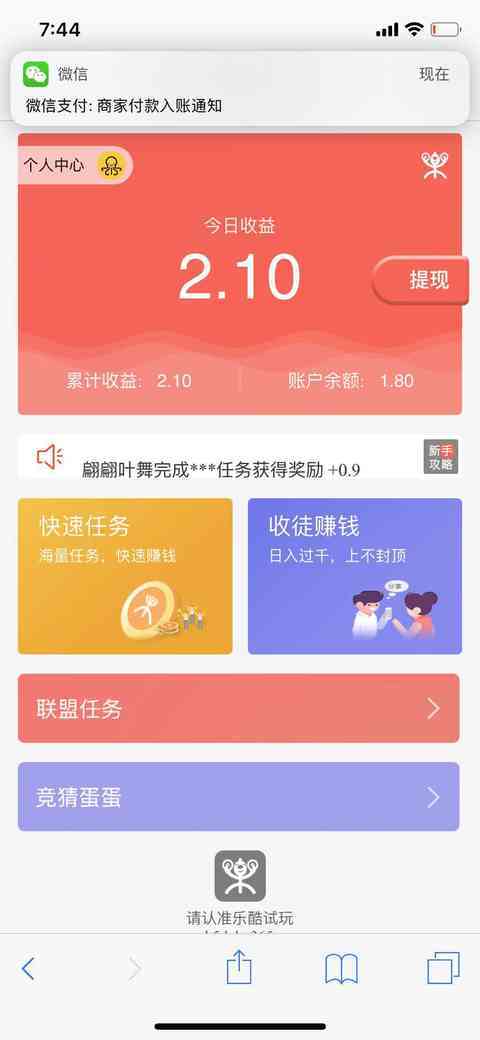 乐酷试玩APP是一款靠谱的试玩平台,乐酷试玩是赚蛋蛋全新升级版本,任务很多,提现秒到账平台,下载乐酷试玩完成相应任务即可轻松赚钱,注册送1元,10元提现秒到账。