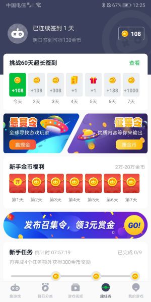 游戏玩家悬赏令,找寻喜爱游戏的玩家,添加趣游戏,感受大量游戏快乐和荣誉。趣游的人的推荐码:201725,新玩家登录就送初学者金币褔利,每日都能够领好几千金币(1000金币=1毛),持续七天,一元就能取现。玩游戏、做任务、签到等还能够得到大量很多的金币奖赏。