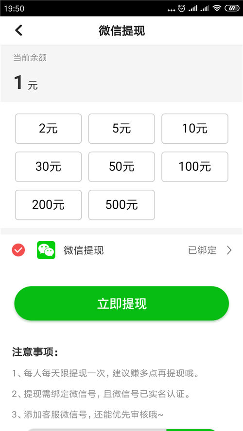 - 说 明:提现2元就能申请,申请还是秒到,