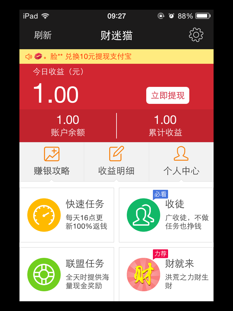 首次安装财迷猫APP就送3元红包,满10元即可提现,任务单价1元起!