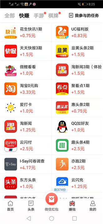 1.在首页中就可以看到众多的做任务赚钱方式,可以选择自己感兴趣或者能够完成的操作。