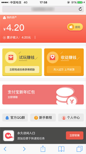 2、试玩任务不定时更新,下午比较多,单价0.8元左右,完成只需三分钟