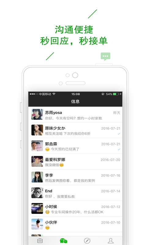 【找人办事】:在首页直接搜索你想要找的技能,找到你想要的技能后,可对其:留言、发送语音、文字信息、拨打电话、或直接预约,以达成交易。