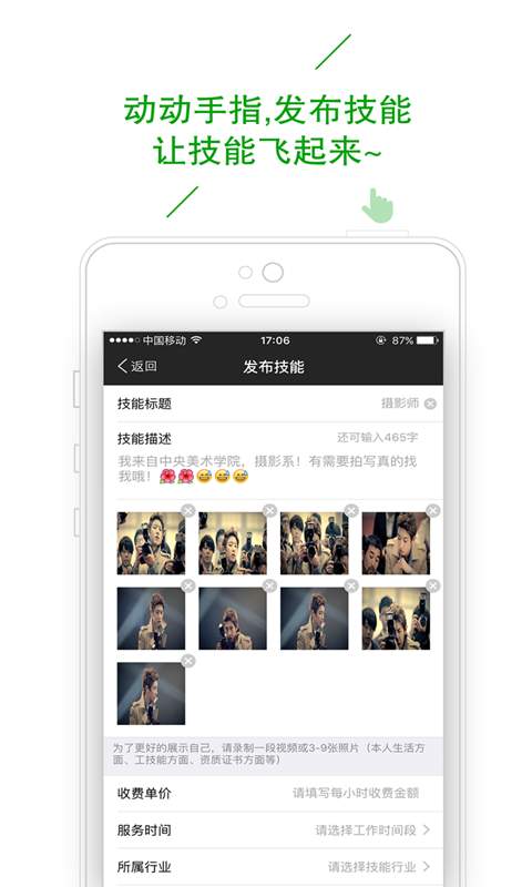 【接单挣钱】:你可以录制一段视频或上传图片发布你的技能,等待被预约。